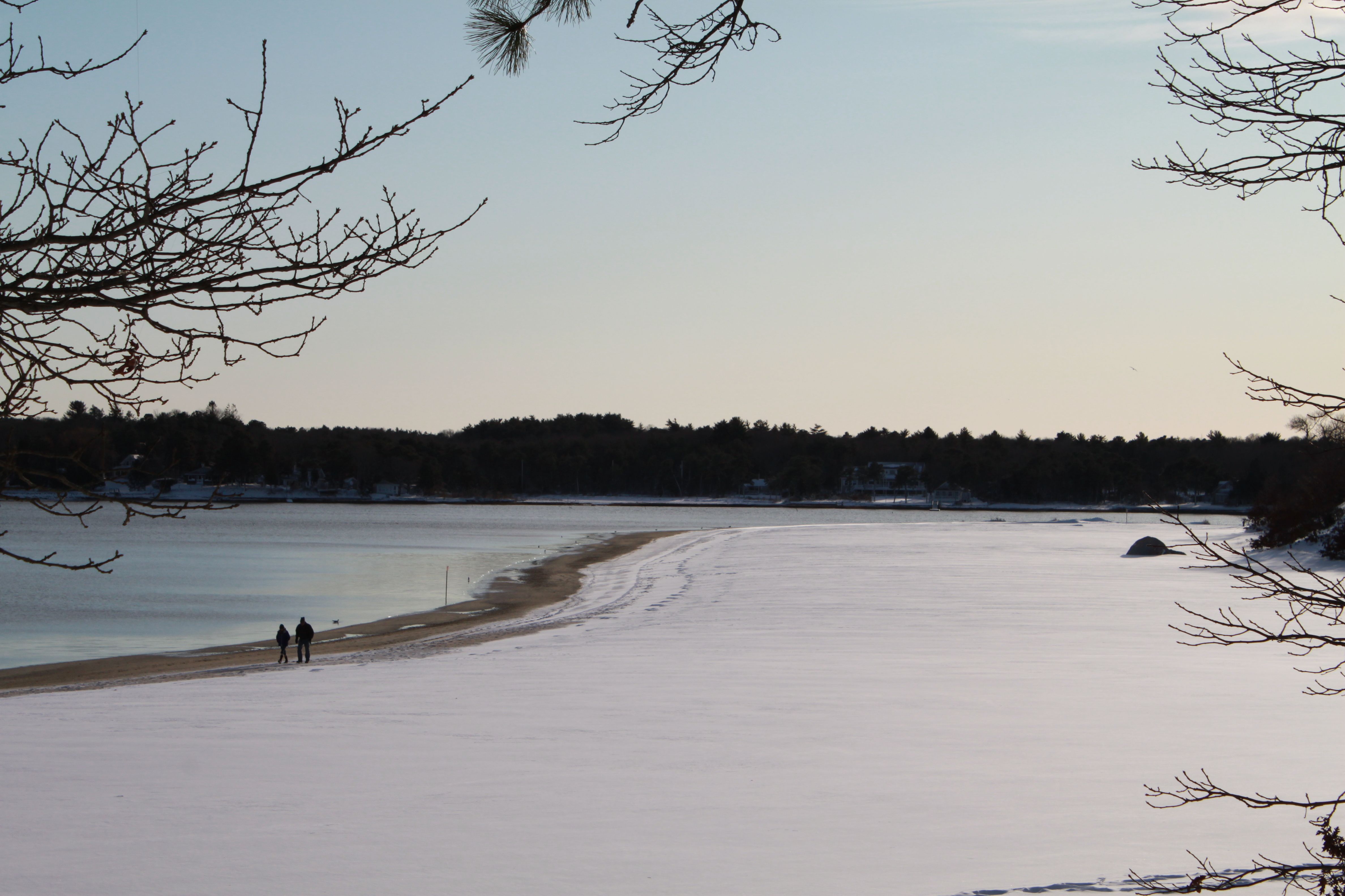 I wish you could have been here this afternoon to walk the beach around the point with me. The air was warmer than I expected, but not warm enough to lower my scarf much below my slightly numb nose. The sand is covered in a seamless blanket of white that even the sea gulls haven’t dared mar. They stood along the fringe of the bay, toes soaking in the icy North Atlantic, wondering why they hadn’t flown south for the winter like their sensible cousins, the geese. Perhaps they were frozen there, I can’t say.