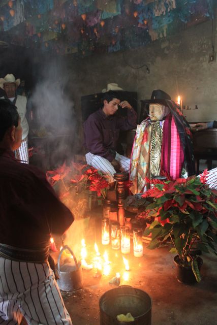 Another 2Q per person gained us admittance to the inner sanctum: very dark, lit only by the rows of candles burning on the concrete floor, Maximon held court with no fewer than three Bruhos (witch doctors) attending him.